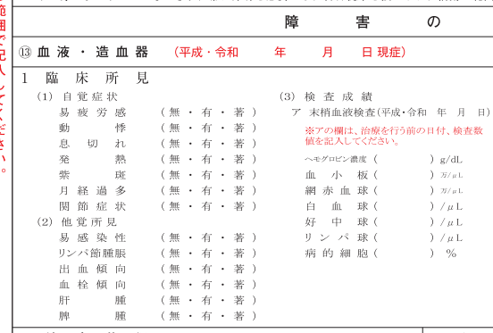 血液中の細胞については、輸血や補充療法などの治療が行われると、治療後に検査数値が一時的に改善し、本来の状態と乖離してしまうため、より適正な認定が行われるために、現症日から見て直近で輸血や補充療法を行う前の検査成績の記入が必要とされています
