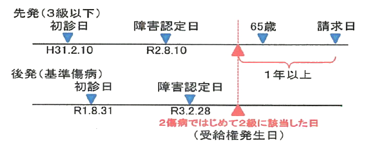 はじめて2級による請求に必要となる書類 2025 4/14 障害年金の色々 2025年4月14日 はじめて2級による請求に必要となる書類 65歳到達日前に「はじめて2級」に該当したことがわかるそれぞれの診断書が必要です。 受給権発生日(はじめて2級に該当した日)と請求日が1年以上経過している場合は、請求日分の診断書(請求日以前3月以内の現症日となっている診断書)も必要です。 受診状況等証明書も、病歴・就労状況等申立書もそれぞれ必要となります。 障害年金の色々